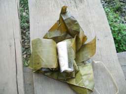 バナナの葉に包んで焼かれたお菓子。甘酸っぱく、ぶりんっとしたピチピチの歯ごたえ。