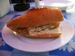 ミンチ棒、ピクルス、トマトを乾いた白いピタパンの長いタイプのもので挟んだ食べ物。断面は大福くらい...続きを読むRead More