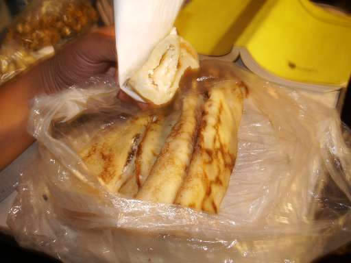 白チーズ(フェタ)を巻いたクレープ状の生地。ちょいコゲたホットケーキのような苦み。チーズは酸味がほのかで、ずしっと重みがある。2レバが無くて、1.87レバくらいの持ち金全部を払った。
