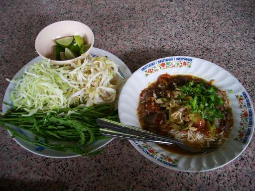 麺はぶつぎれで食べやすい。スプーンで食べられる。トマトとライムの酸味、スープはさらり旨み。血のプリンのサッパリした軽いうまみがよく合う。