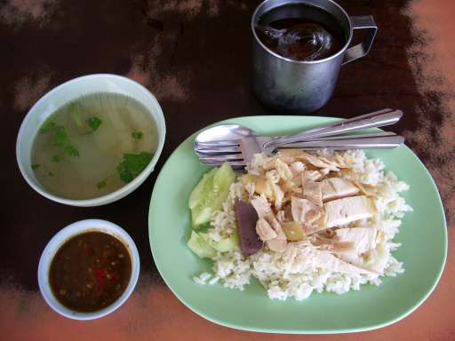 パラパラの薄味の米に、茹でた皮付きの鶏。大根をトロトロに煮たのがごろっと1ヶ入っている鶏スープ。唐辛子と生姜入りの甘いタレ。