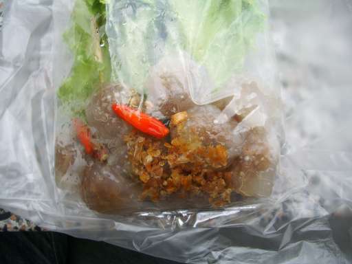 皮はタピオカぽい感じ。中身は甘く、野菜っぽいサクサクとピーナッツっぽいポリポリと、ほんの少し豚ひき肉が入っている。