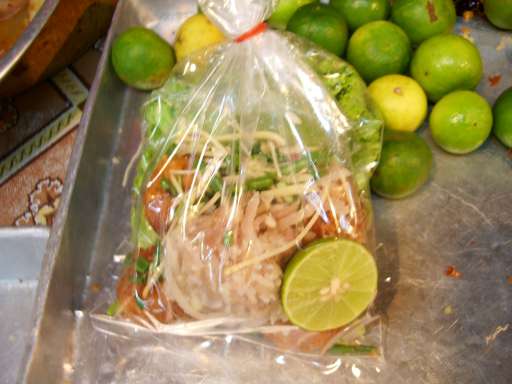 ライスコロッケと豚皮入りミンチ、ねぎ、ピーナッツ、しょうが、唐辛子などなどをビニール袋にまとめたセット。袋のままぐしゃぐしゃに混ぜ、ライムをしぼる。すると、しっとりとしたチャーハンのようになる。ライスコロッケの表面は硬いのでかたまって残るが、メリメリとして香ばしく、お焦げのよう。