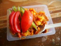 魚肉ソーセージ味のものとポテトと玉ねぎみじん切りをトマトソースで和えたやつ。注文を受けてから鉄板...続きを読むRead More