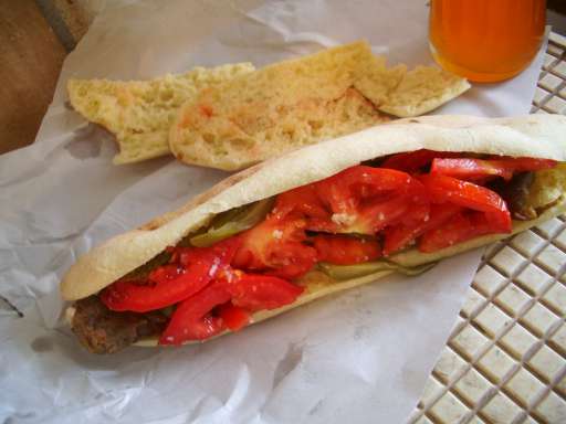 ミンチ棒、ピクルス、トマトを乾いた白いピタパンの長いタイプのもので挟んだ食べ物。断面は大福くらいのバランスで具をパンが包む。