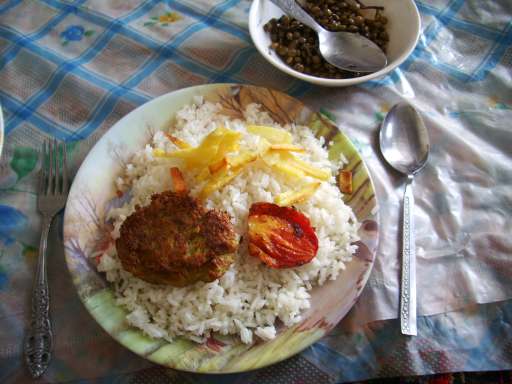 香りのいいパラパラの米に、『ミックス』と焼きトマトとフライドポテトを乗せたご飯。