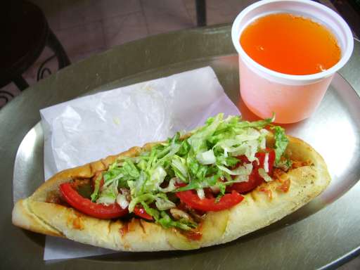 スライストマト、レタス千切り、ひりっと辛いトマトソース、ピクルス風味、パンはふかふかしっとり。