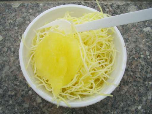 サラスパみたいな細しの長さ5cmくらいの麺が、かき氷シロップの半分フローズンな中に入っている。レモン汁をかけていただく。