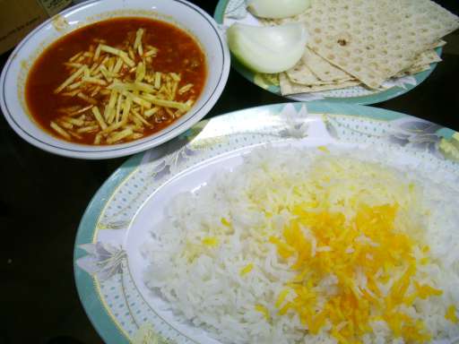 レンズ豆と牛肉の入った酸味の効いたシチュー。レモン系のさっぱりした味の裏にコクが隠されている。棒状のポテトチップスをトッピングしてある。