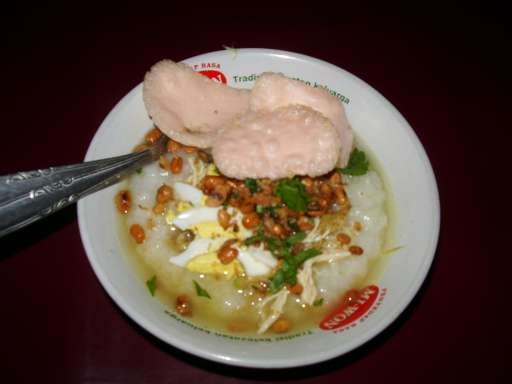 白がゆに鶏スープをかせた感じの料理。かゆはねっとりと米の風味満載。ポリポリとする大豆、香ばしいフライドオニオン、鶏肉のほぐし身、ゆで玉子、えびせん。そして何やら紫蘇に似た風味のハーブが入っている。