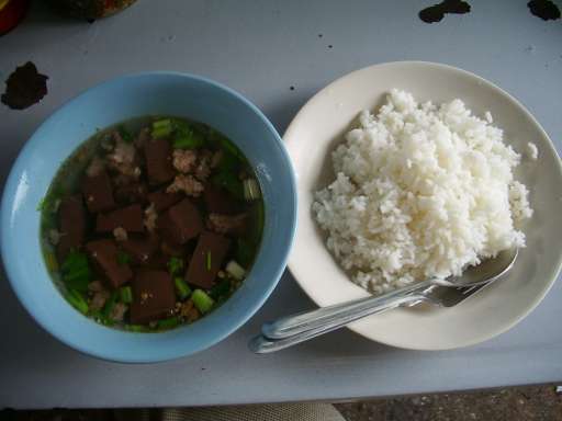 ねぎ、パクチー、豚肉団子、血を固めたもの、ニンニク入りのあっさり透明スープ。