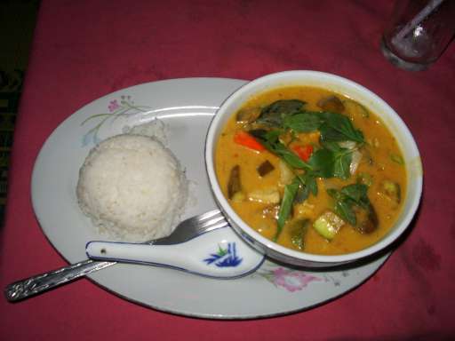 なす、玉ねぎ、ピーマン、鶏肉、ニンジン。と、とても具沢山なカレー。ちょっと煮えきっていなかったが、食べ始めて5分ほどしたら煮えた状態になった。