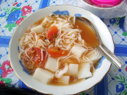 ゆで麺にトマトスープと大豆味噌を加えたもの。