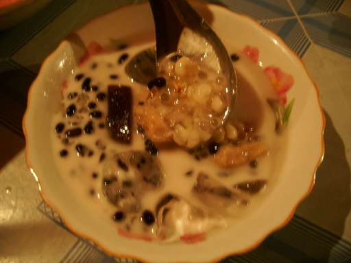 もちっとした黄色っぽい具、黒っぽい具、あともう一種類の具。 氷の上に3種を盛ってココナッツミルクをかけたもの。