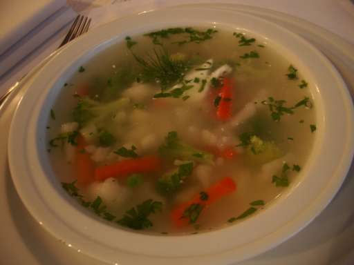 ニンジン、さや付きグリンピース、ポテト、カリフラワー、ブロッコリー、パセリ、サワークリーム入り。