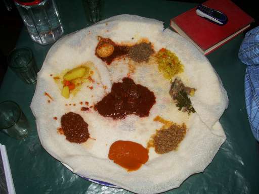 ケニア人のモセスとエリウツとの3人で一つの大皿を囲んで食べる。インジェラを追加すると、幅10cmくらいにカットされてくるくると巻かれたものが出てきた。それを食べきったところで3人ともお腹いっぱい。