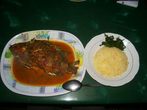 トマト、パクチーと少々のスパイスで煮た、揚げティラピア一匹。