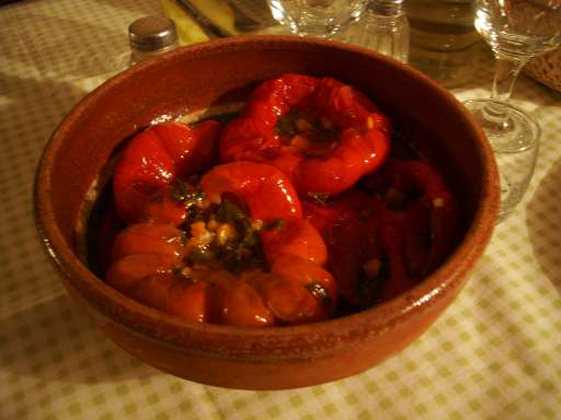 パプリカの食感はナスの煮浸しのようにじゅるんとして、甘みとやわらかさとつっぱりがある。具はサクサク感が残る仕上がりで少々のニンニクのコクと香りが個性を出している。じゅわっの中にコリッ。野菜類の甘みがたっぷり出ていて、それぞれの香りが調和する。