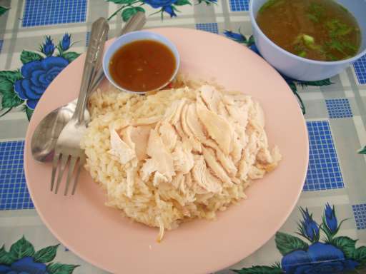 鶏ダシで炊いためし。油が抜けてじわっとうまみの出る薄切り肉。タレは甘酸っぱく、酸味と同じくらい辛さがある。