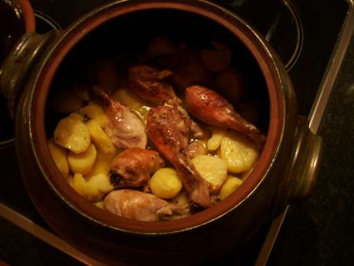 土鍋ごとオーブンに入れて作られたポテトとチキンのグリル。