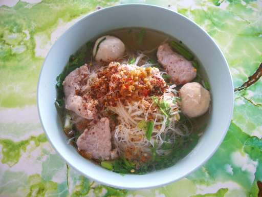 ニンニクチップ風のもの、パクチー、ねぎ、魚団子にやわらかい豚肉。唐辛子で辛い汁じわり。