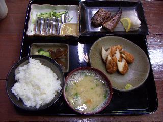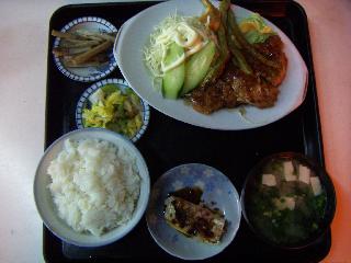| カウンターだけの8席の小さなこの食堂は、 老夫婦が経営している。 薄めの繊維っぽい肉のカツに、さっぱり甘酸っぱいソースがかかっている。 サクサクの揚げインゲンが3本添えてある。 味噌汁はわかめ・とうふ・じゃがいも・ねぎ と具沢山で食べ応えがある。 おしんこから不意にニンニクの強い香りがしてガツンとやられた。 | |