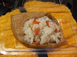 | 油揚げのみならず中までじゅわっとジューシーで、米がほろほろとやわらかく崩れる。 タケノコの鋭い触感と、歯先をクリックするゴマが楽しい。 | |