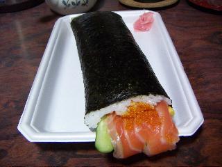 | 海鮮みっちりの超太巻き。 鮭・卵・きゅうり・とびっこ・白身魚が、ワサビ&マヨネーズと共に詰め込まれており、 一口毎にいろんな角度で飛び込んで来る。大根の「つま」がひろっと一本だけ入っていたのは、 やっぱりおつとめ品な商品だからなのだろう。 | |