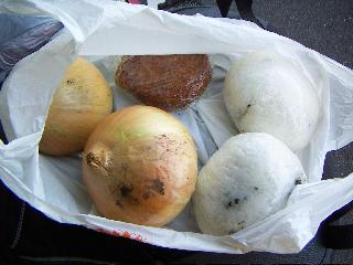 | 湯の児温泉の松の家旅館からチェックアウトする時に、笑顔がまぶしいおかみさんが 用意しておいてくれたもの。おにぎり2個・さつま揚げ・サラダ玉ねぎ2個。 | |